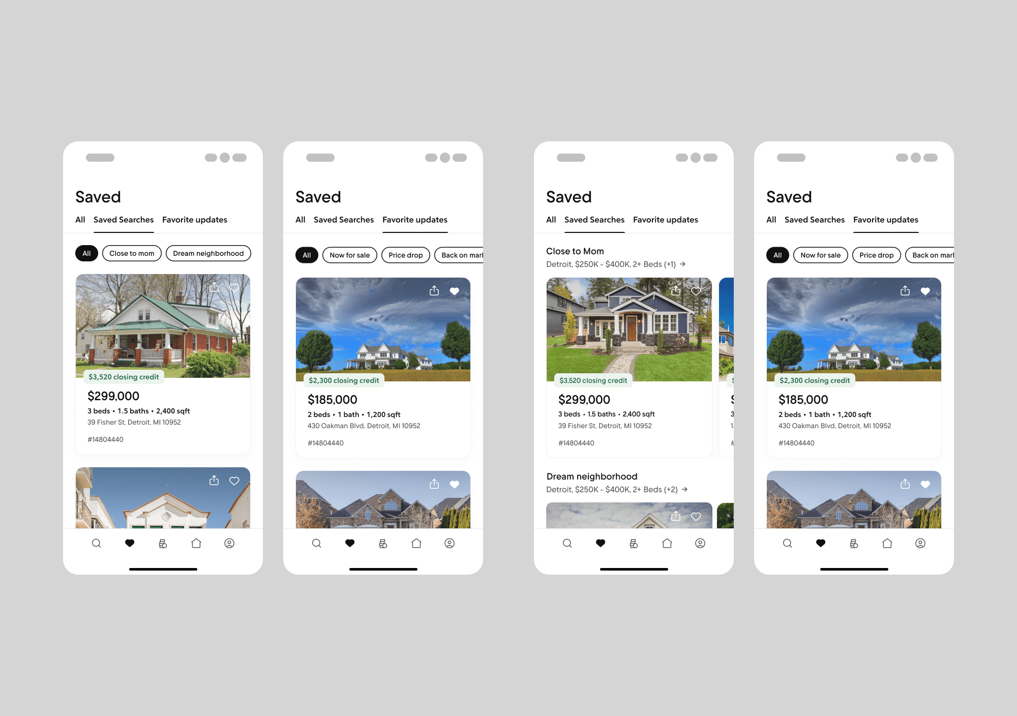 Dynamic Interface Evolution - We had begun exploring adaptive UI patterns where saved properties would display enhanced information and actions, creating a more purposeful distinction between browsing and saving modes.